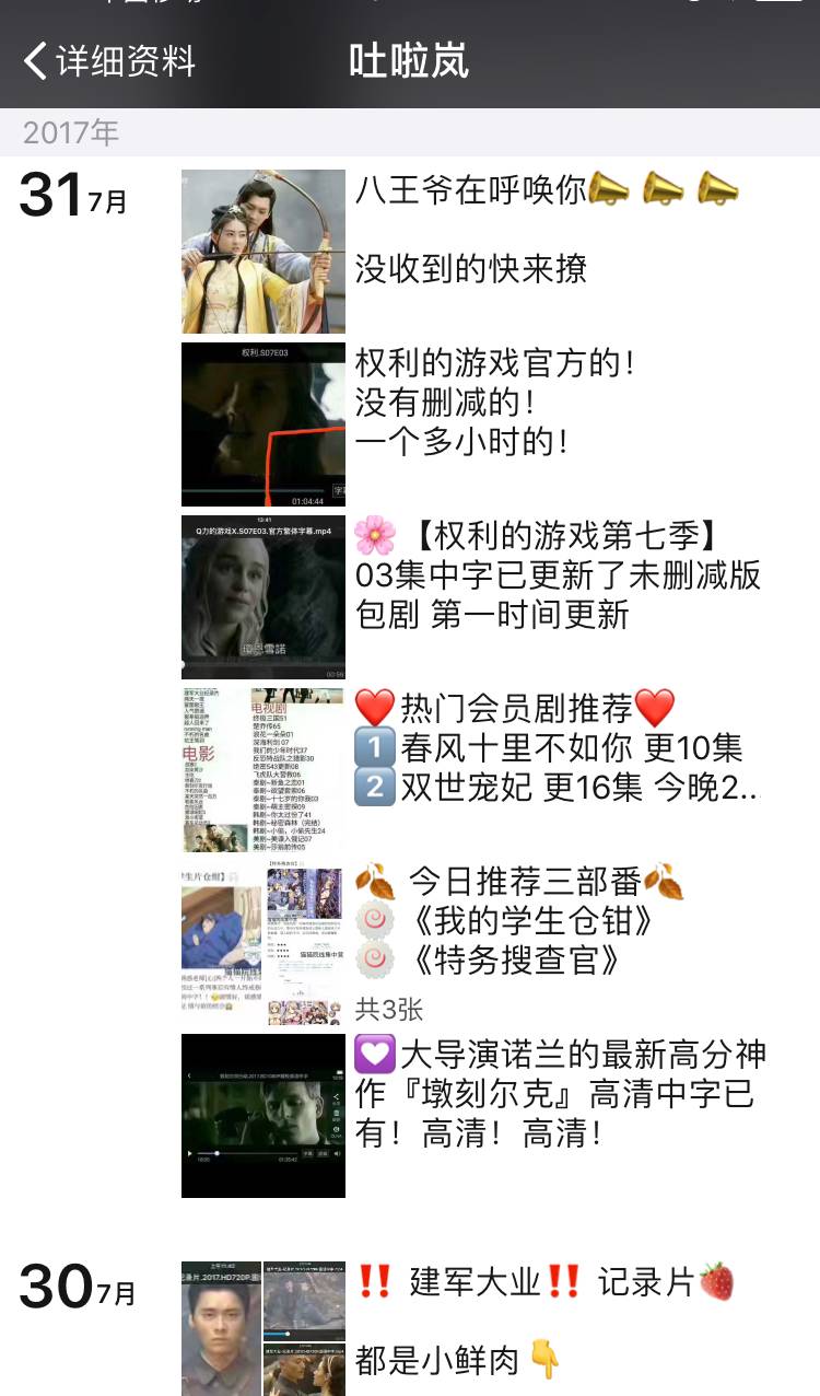 “太多了,你想看什么?美剧、英剧、韩剧、国内网剧、日本动漫,上映的没上映的,还有已经下架的,很多视频客户端上没有的电影和剧集,我都有。你可以看看我的朋友圈,上面贴出来的资源都可以提供,价格也写得很清楚。”岚岚热心地回答记者的问题。