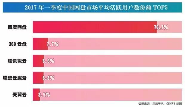 据易观最新发布的《2017第一季度中国网盘市场份额监测报告》显示,2017年第一季度网盘市场平均月活用户数前三名的厂商为百度网盘、360云盘和腾讯微云,其活跃人数市场占比分别为76.7%、7.7%和6.6%。